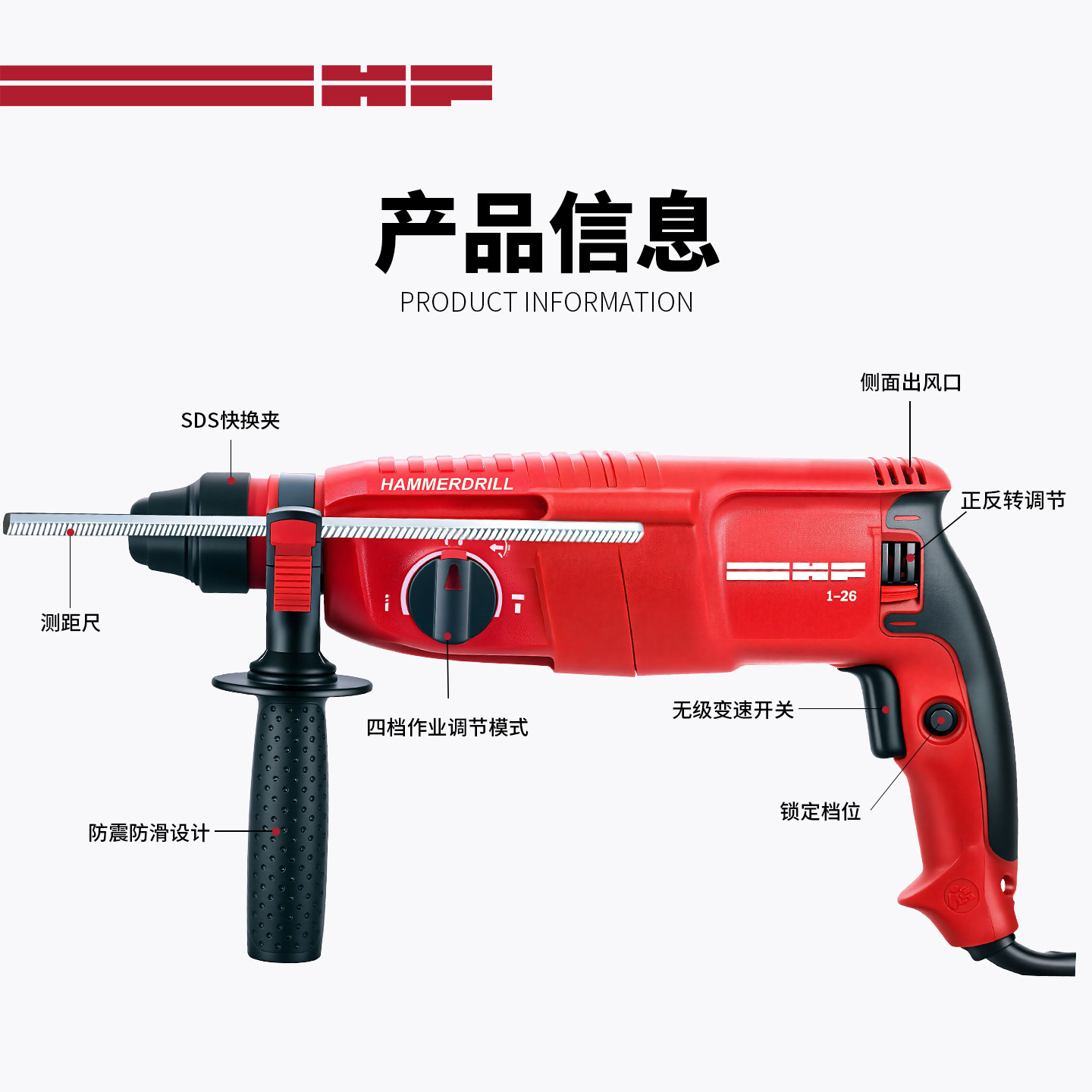 空载转速:0-1150r/min 最大钻孔能力:混凝土26mm、木材30mm、钢材13mm